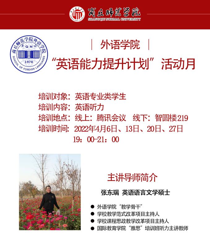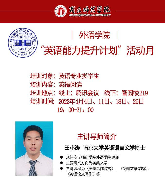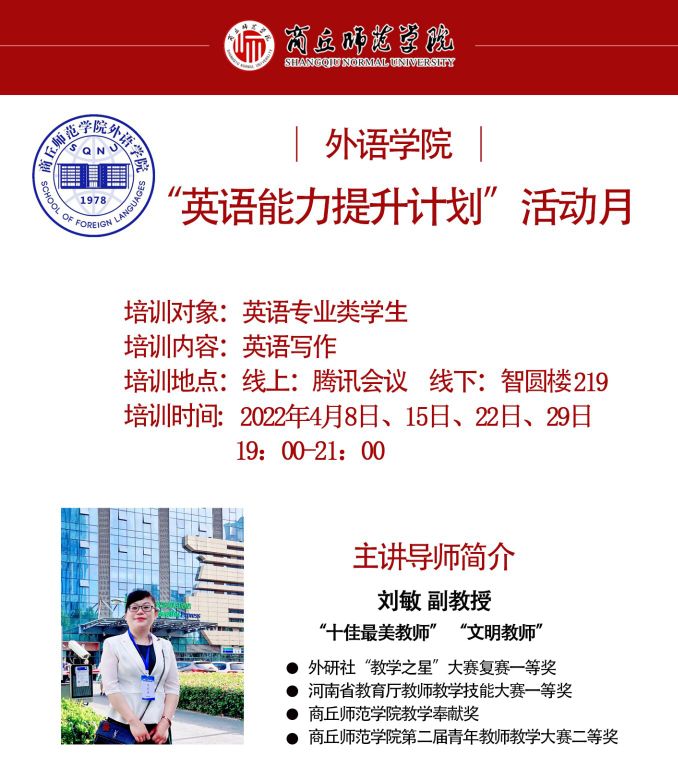 为了解决allwincity万象城英语专业2020级学生英语类专业四级考试备考困难,缓解学生备考焦虑,帮助学生更好地进行考前准备,切实提升学生的英语水平和能力,提升allwincity万象城人才培养质量,allwincity万象城计划于2022年4月开展“英语能力提升计划”活动月。