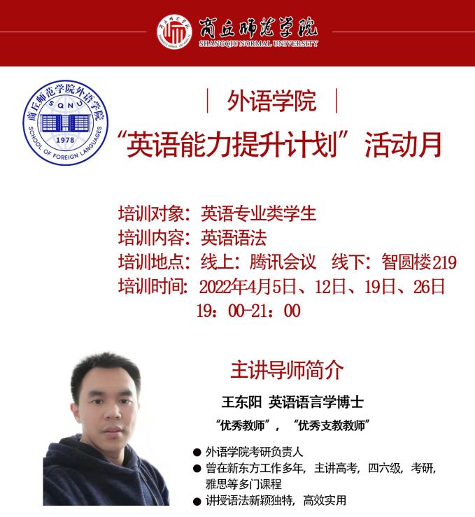 活动计划利用四周时间对2020级英语类专业学生进行英语听力、阅读、语法、写作等方面的专业技能进行指导和针对训练。邀请的主讲导师有:王小涛老师,负责英语阅读教学;刘敏老师,负责英语写作教学;张东瑞老师,负责英语听力教学;王东阳老师,负责英语语法教学。