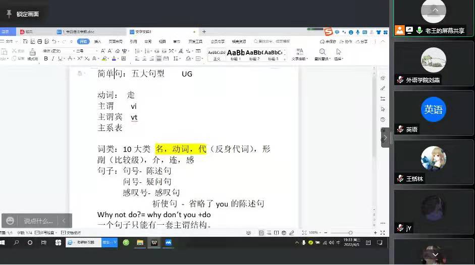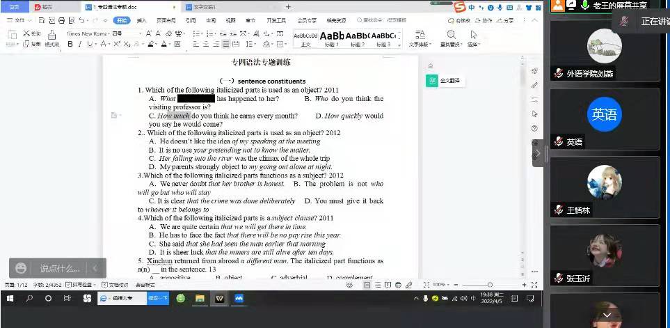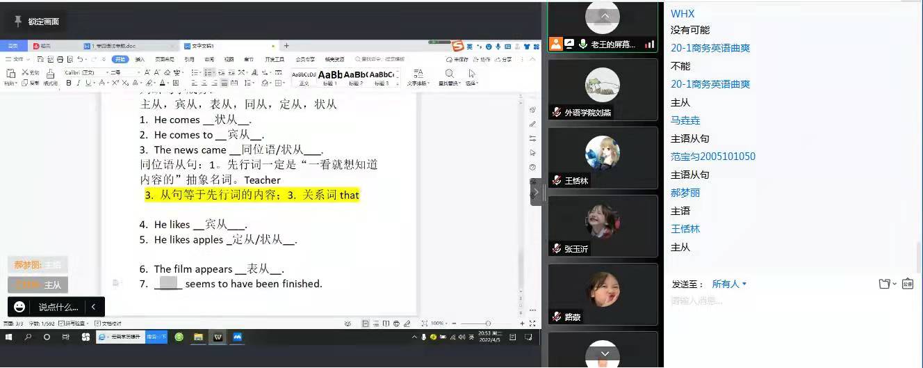 王东阳老师首先分析了近十年来的专四语法考试特点,向同学们强调了语法的常考点以及重难点,让同学们对这节课的听课重点有了整体了解。王东阳老师总结了最近12年的专四语法真题,精心准备了教案,首先为同学们构建了语法的整体框架,然后按照专四语法考试的重难点进行了细致讲解。先后讲解了句子的成分,系动词的判断,如何判断句子成分等语法知识。讲解语法知识时王东阳老师深入浅出,循序渐进,同时还十分关注学生的反映,不断与学生进行互动,实时关注网络情况,及时进行调整。