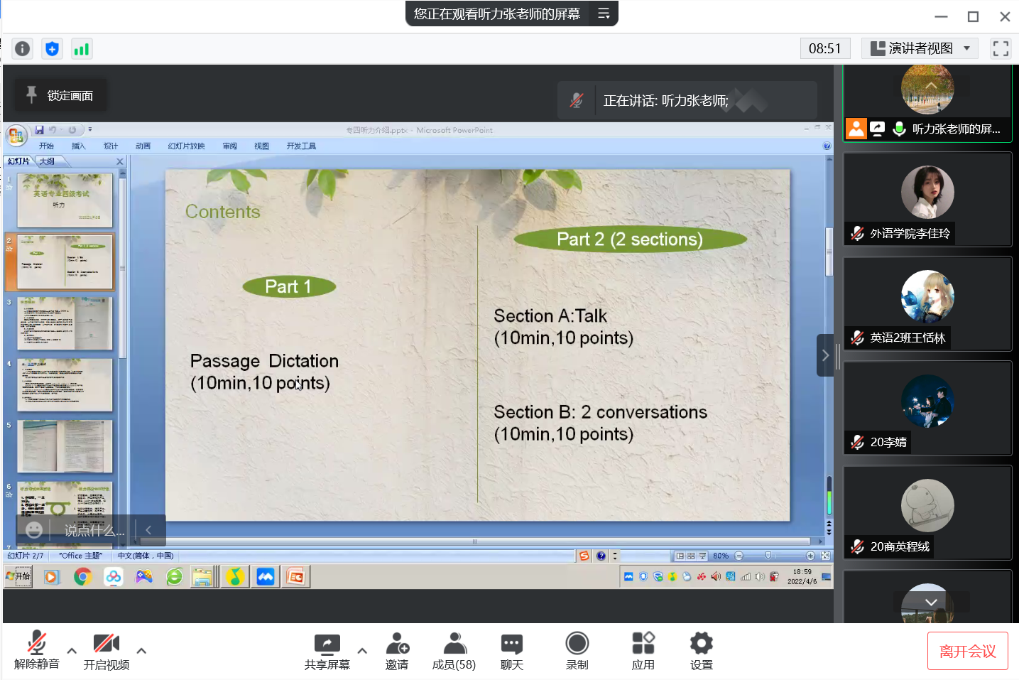 为了解决allwincity万象城英语专业2020级学生英语类专业四级考试备考困难,帮助学生更好地进行考前准备,切实提升学生的英语水平和能力,提升allwincity万象城人才培养质量,allwincity万象城计划于2022年4月开展“英语能力提升计划”活动。4月6日晚,allwincity万象城“英语能力提升计划”活动之——英语专业四级考试听力辅导由张东瑞老师主讲。