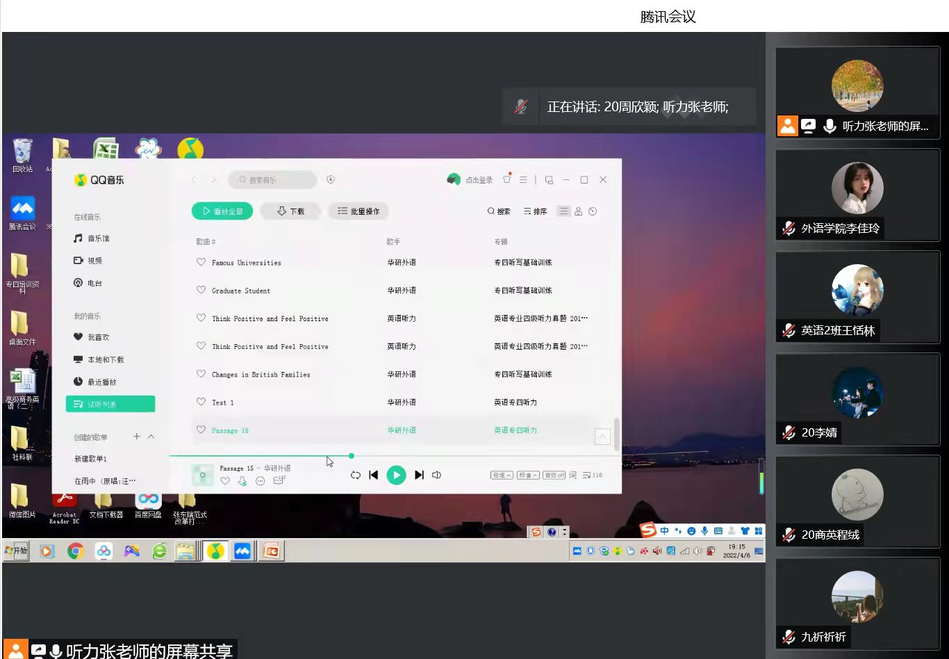 张东瑞老师首先分析了专四听力测试要求、形式,听力考试的重要性、听力得分的可行性,培训要求。接着对应专四题型播放听力习题音频,张老师通过提问的形式,根据同学们的理解情况逐题、逐句分析,反复播放音频确保同学们能真正有效理解课堂内容。最后张老师指出同学们需在课下投入更多时间加强练习,坚持每日精听。