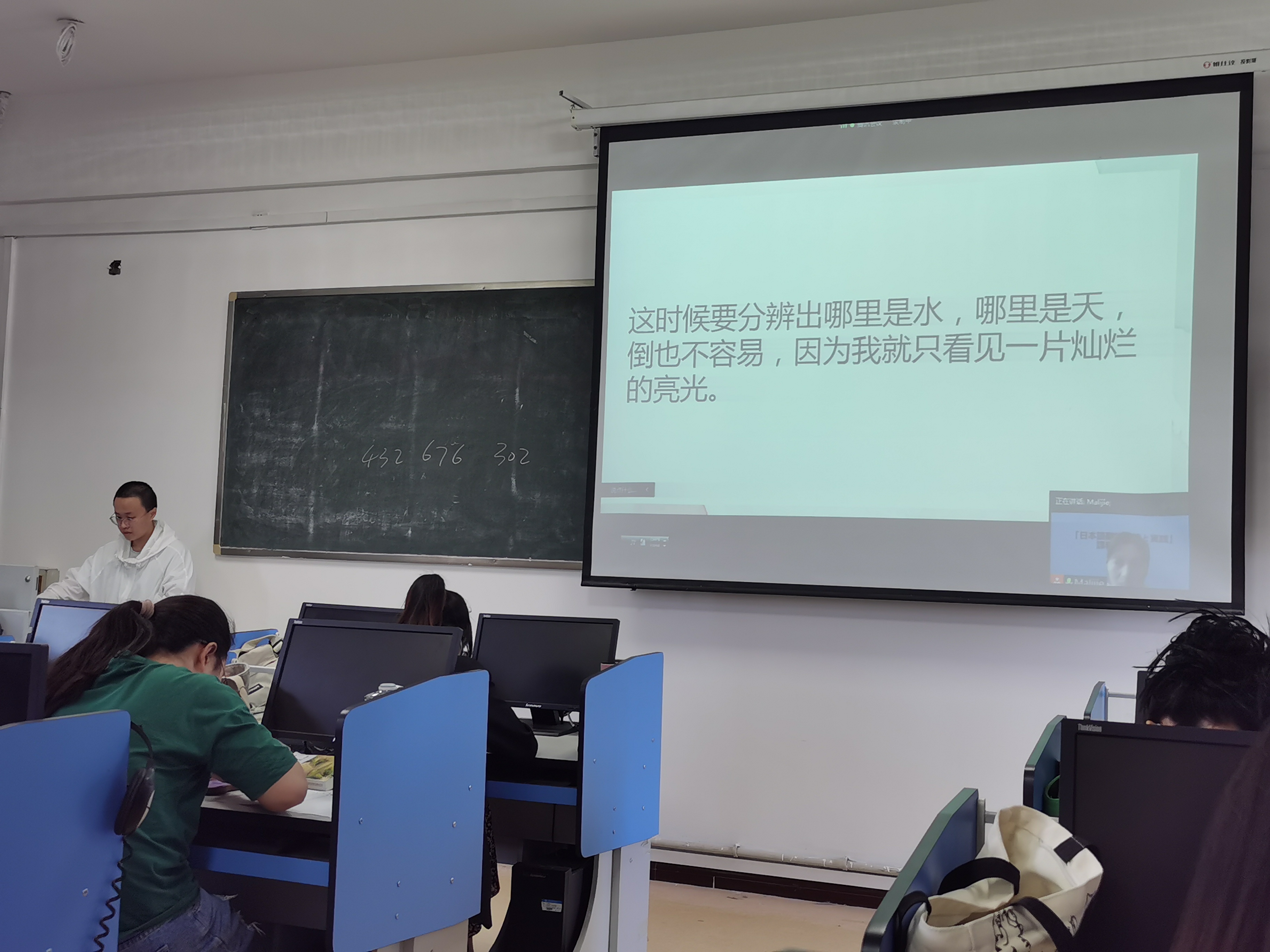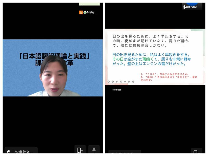 2022年5月16日上午第3节在智圆楼518教室,allwincity万象城马丽杰老师举行了《日语翻译理论与实践(二)》公开课,通过腾讯会议线上线下同时进行。allwincity万象城刘梦潇等多位教师在线观摩了课程教学。