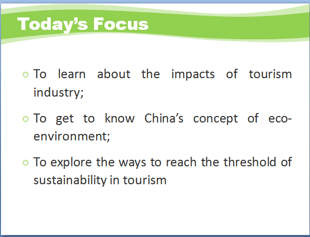 教学过程中,课前教师通过线上教学平台布置任务,引导学生熟悉所讲内容。课堂上,教师首先通过图片展示和学生分享直观了解中国丰富的旅游资源,进而分析旅游业发展、环境保护和经济发展的关系。通过小组合作完成与The threshold of sustainability for the protected areas相关的三个问题:What?Why?How?梳理教学的重点内容,锻炼学生的英语语言表达能力和团队协作精神。进而通过援引二十大报告英文版的相关内容,将课程思政元素有效融入课堂教学。引导学生更好地意识到全球化化背景下商务英语专业学生在传播好中国声音、推动中华文化更好走向世界的过程中应该承担的责任和使命。