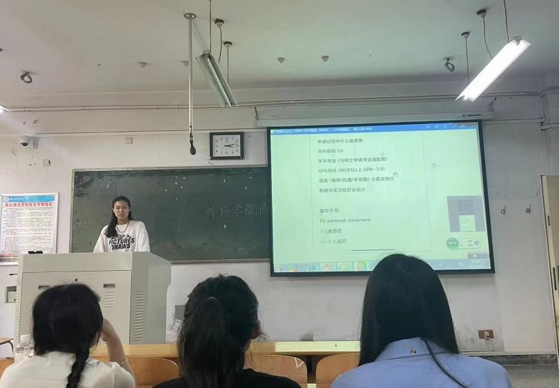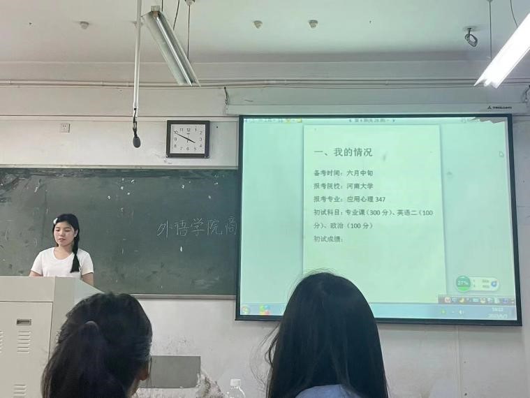 交流会上,四位同学结合自身经验,从院校选择、备考计划、学习方法和时间分配等方面做了汇报,并且和参加交流会的同学们分享了一些优秀的学习资源和公众号。在交流阶段,四位同学还和同学们面对面交流,认真回复了同学们提出的问题,并鼓励同学们要相信自己,坚持不懈,不负青春。