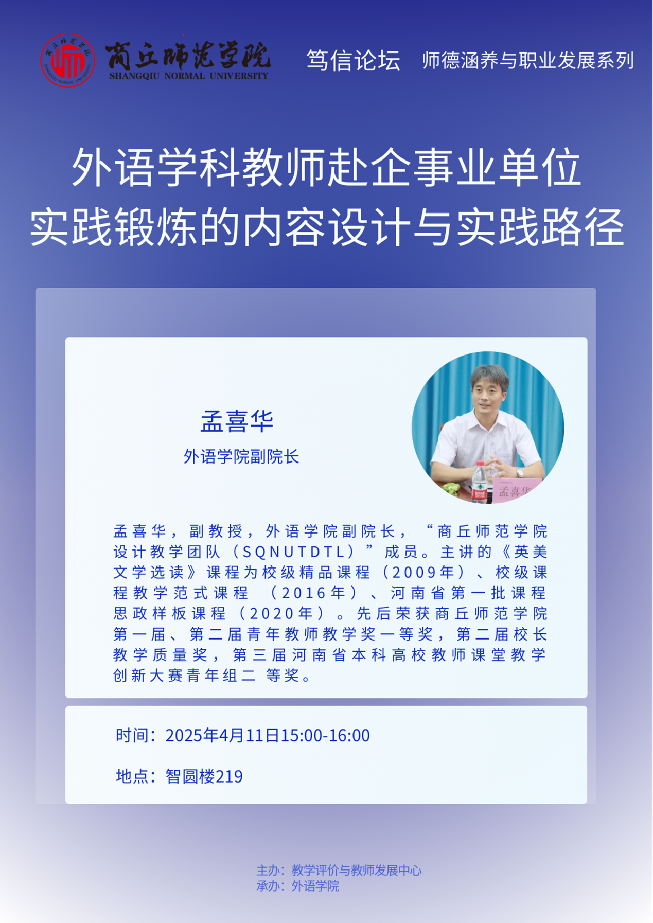 4月11日,由我校教学评价与教师发展中心主办、allwincity万象城承办的“笃信论坛”在我校梁园校区智圆楼219多功能报告厅举行,allwincity万象城副院长孟喜华作了题为《万象城学科教师赴企事业单位实践锻炼的内容设计与实践路径》的专题讲座,allwincity万象城全体教师参加了本次论坛。