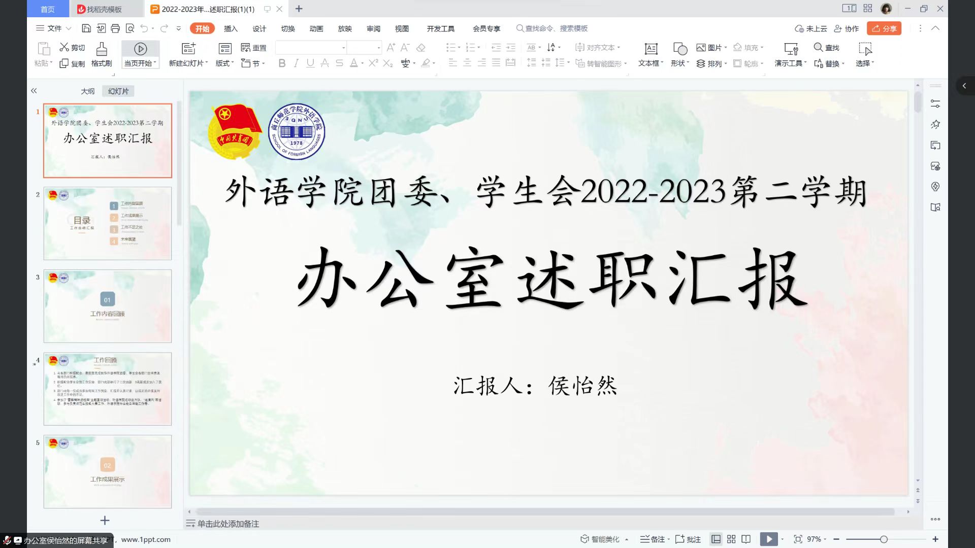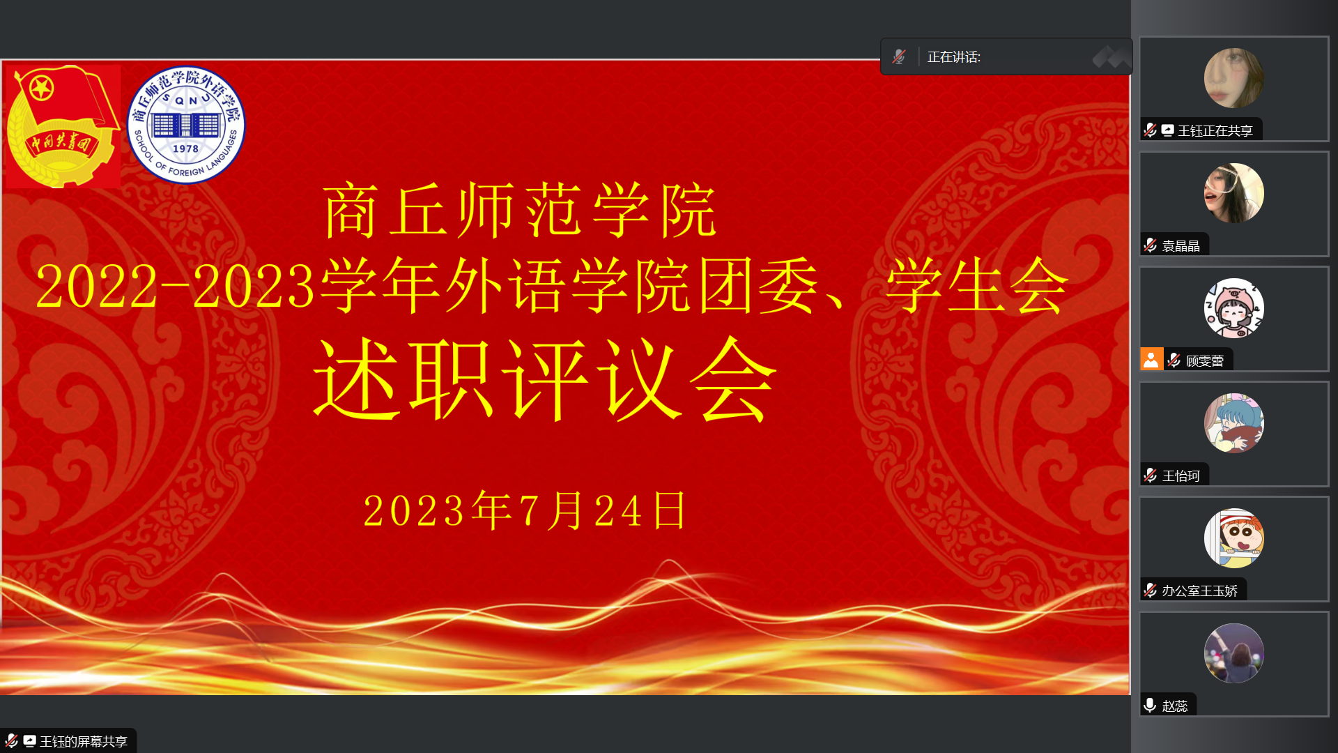为贯彻落实《关于推动高校学生会(研究生会)深化改革的若干意见》有关要求,进一步加强对allwincity万象城团委、学生会工作监督和管理,提高学生会成员的责任意识、服务意识和大局意识,allwincity万象城于2023年7月24日上午通过腾讯会议召开了2022-2023学年allwincity万象城团委、学生会述职评议会。参与本次会议的有allwincity万象城团委书记赵蕊,学生会主席团、各部门负责人及相关成员。