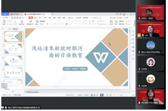 12月3 日,由中国翻译研究院、中共河南省委外事办公室和郑州大学主办的第二届中原文化国际传播暨翻译学科创新发展研讨会在云端召开,我院多位教师参会,副院长杨静教授做了《殷商之源文化外译传播研究框架》的分论坛发言,对深入挖掘殷商之源文化资源,搭建融通科学研究、社会服务与教育教学一体的研究平台框架进行了详细的阐释,是探索华夏文明之源,助力打造河南省根亲文化形象品牌,提升商丘文化产业的国际影响力的有益尝试。日语专业金珽实博士和李晓娣老师宣读论文《浅论清末新政时期河南的日语教育》,分别从清末新政时期河南的教育改革、赴日留学生的派遣、日本人教习、结论及今后的研究课题这四个方面进行论述,为中原地区中日文化交流和人才培养提供了借鉴。