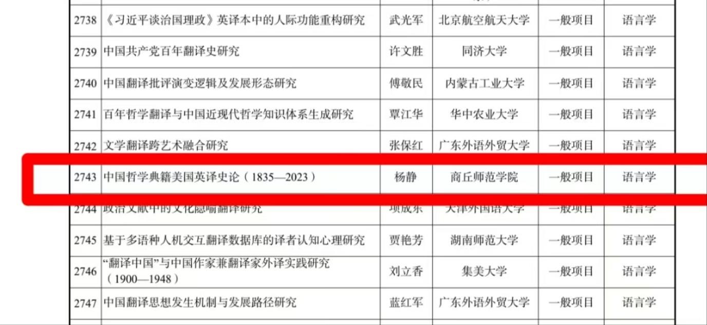 近日,全国哲学社会科学工作办公室公布了2023年度国家社科基金项目评审结果,我院副院长杨静教授主持的《中国哲学典籍美国英译史论(1835-2023)》获批立项。该项目的获批实现了allwincity万象城建院(系)45年以来国家社科基金项目零的突破,也使学院科研工作迈上了新的台阶,显著提升了学院的科研层次和学术水平,对学院各项工作都起到了积极的示范引领作用。