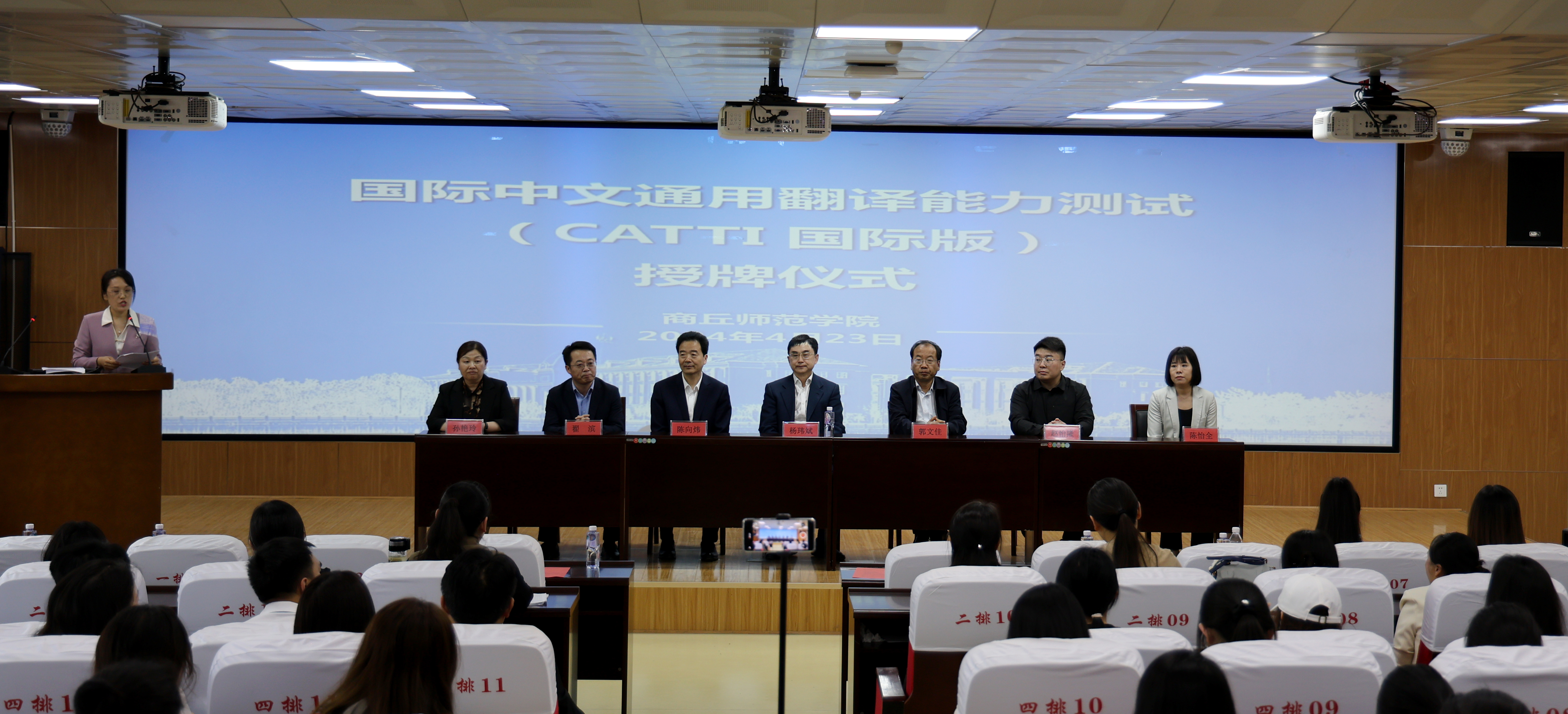 4月23日下午,全国翻译资格考试(CATTI)国际版授牌仪式在我校智圆楼219报告厅举行。全国翻译专业学位研究生教育指导委员会专家委员会委员、中共河南省委外办原副主任杨玮斌、中国外文出版发行事业局全国翻译专业资格(水平)考试项目中心海外考试部主任赵怡隆、中国外文出版发行事业局CATTI项目管理中心核心专家陈怡全、译线通翻译校企合作事业部经理鲍俐利,万象城体育awcsport校长陈向炜、副校长郭文佳、副校长翟滨、allwincity万象城院长孙艳玲以及allwincity万象城党政领导班子、骨干教师和学生代表出席仪式。授牌仪式由allwincity万象城副院长杨静主持。