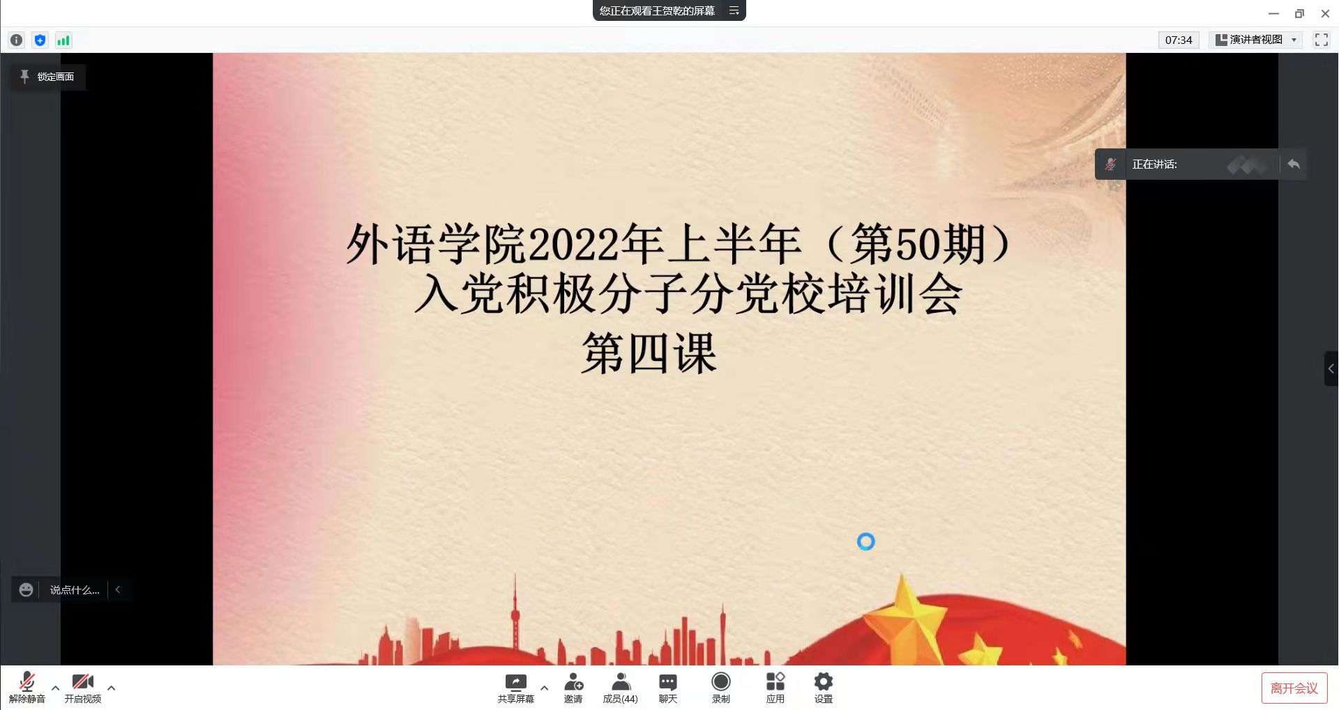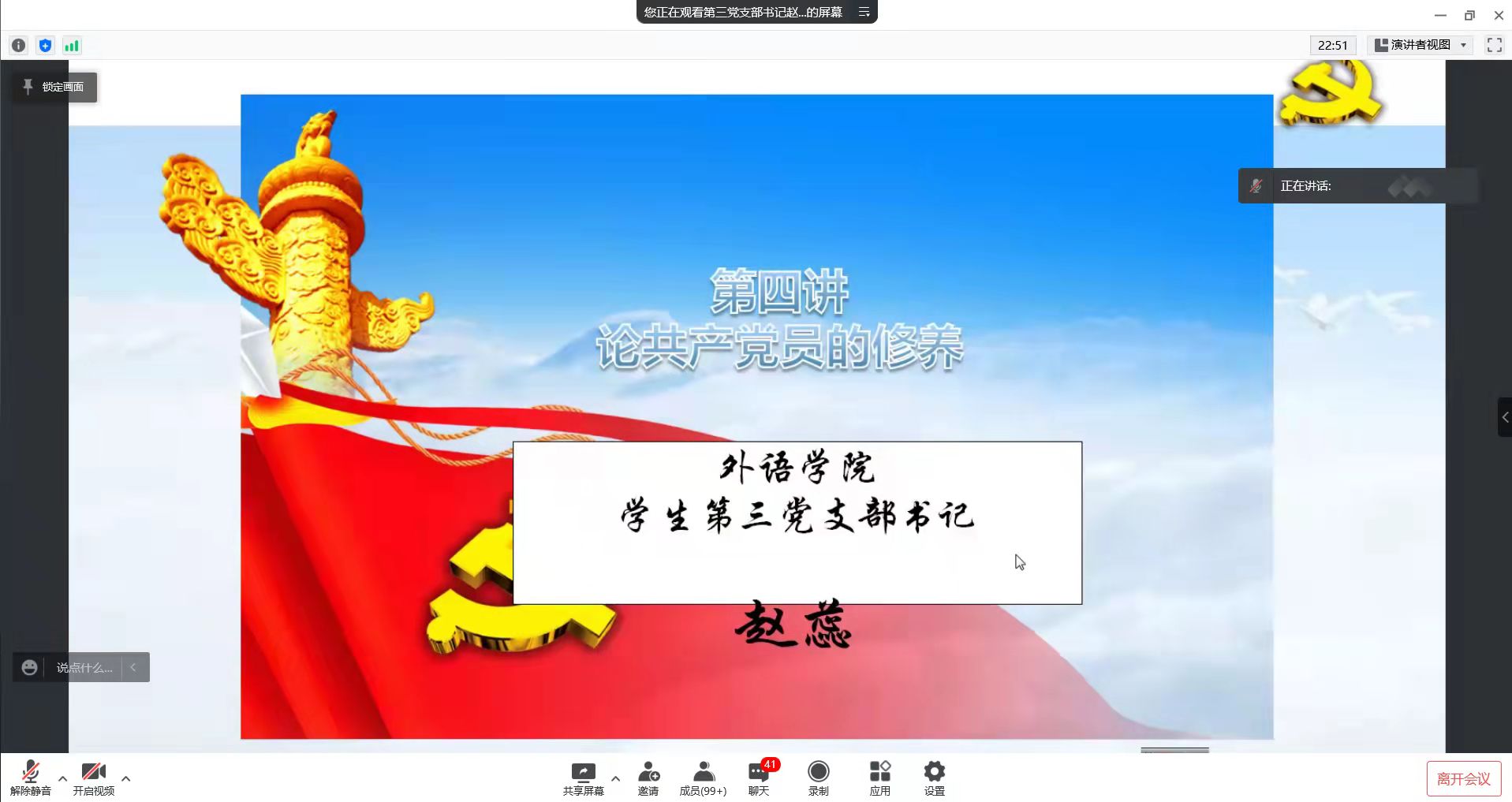 为提高allwincity万象城积极分子的思想觉悟,4月6日中午,allwincity万象城团委书记、学生第三党支部书记赵蕊通过腾讯会议的形式为2022年上半年(第50期)入党积极分子讲授《论共产党员的修养》专题党课。allwincity万象城203名入党积极分子参会。