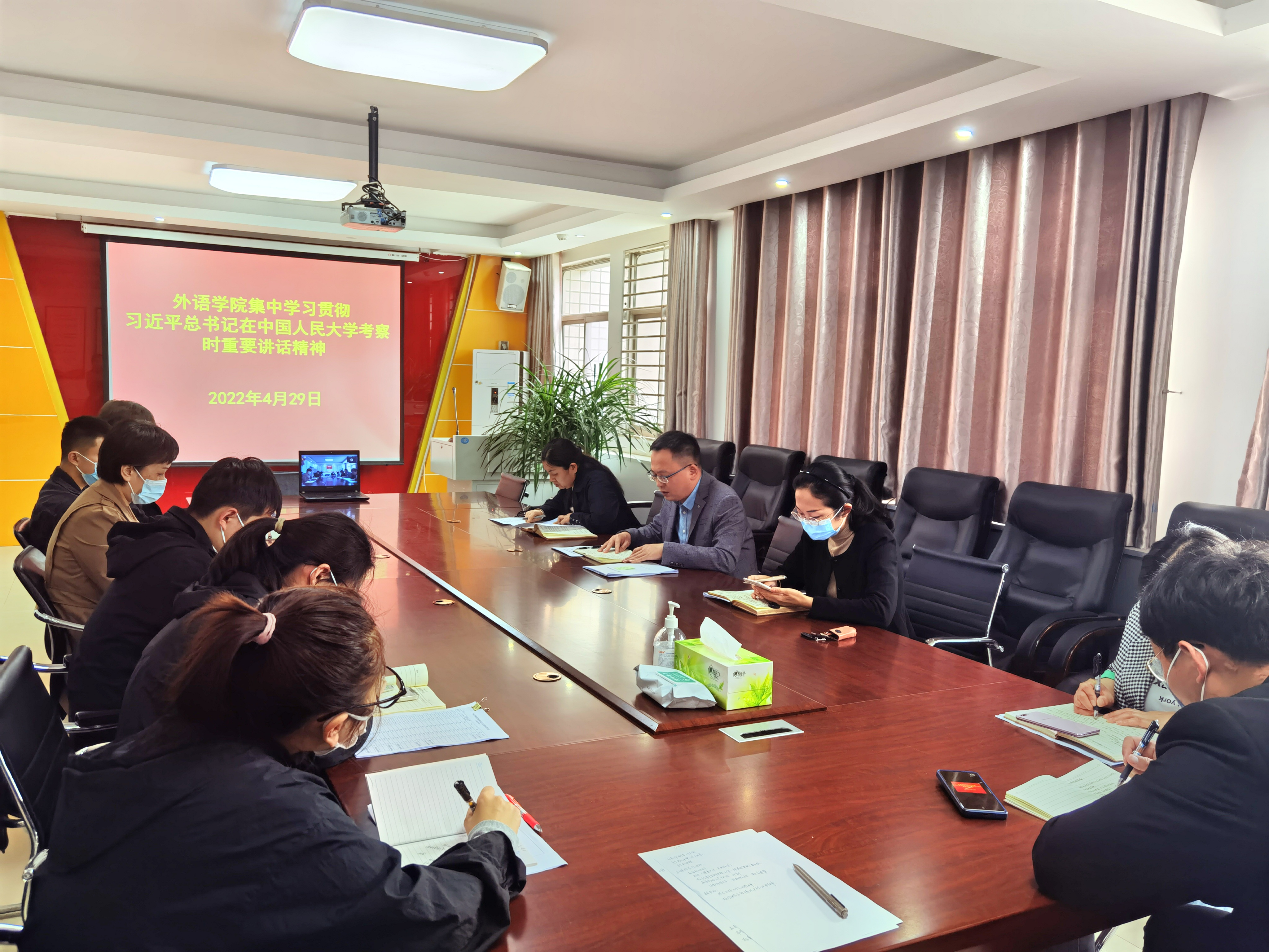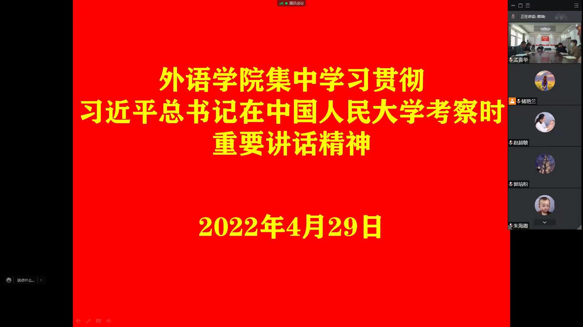4月29日下午,allwincity万象城通过腾讯会议(校外人员)和线下(在校行政值守人员)相结合的形式,集中学习贯彻习近平总书记考察中国人民大学时重要讲话精神,全体教职工参加会议。