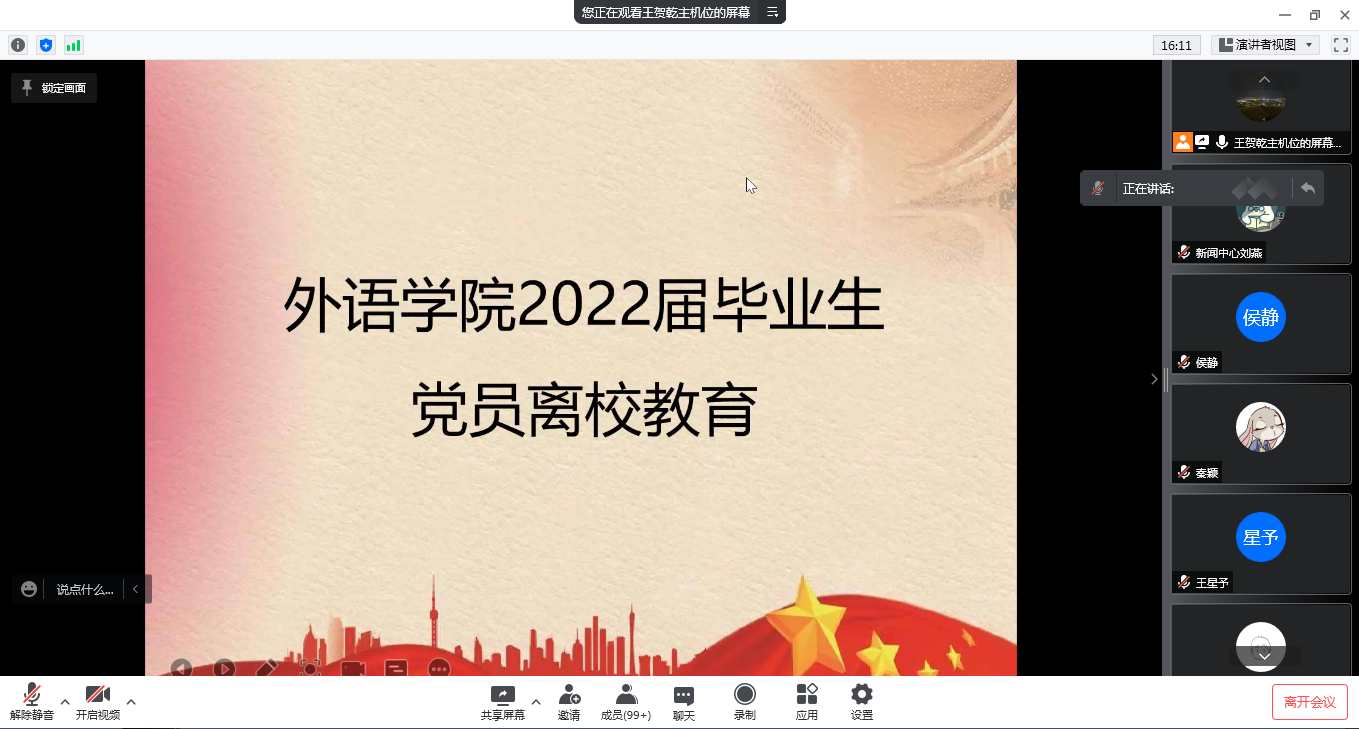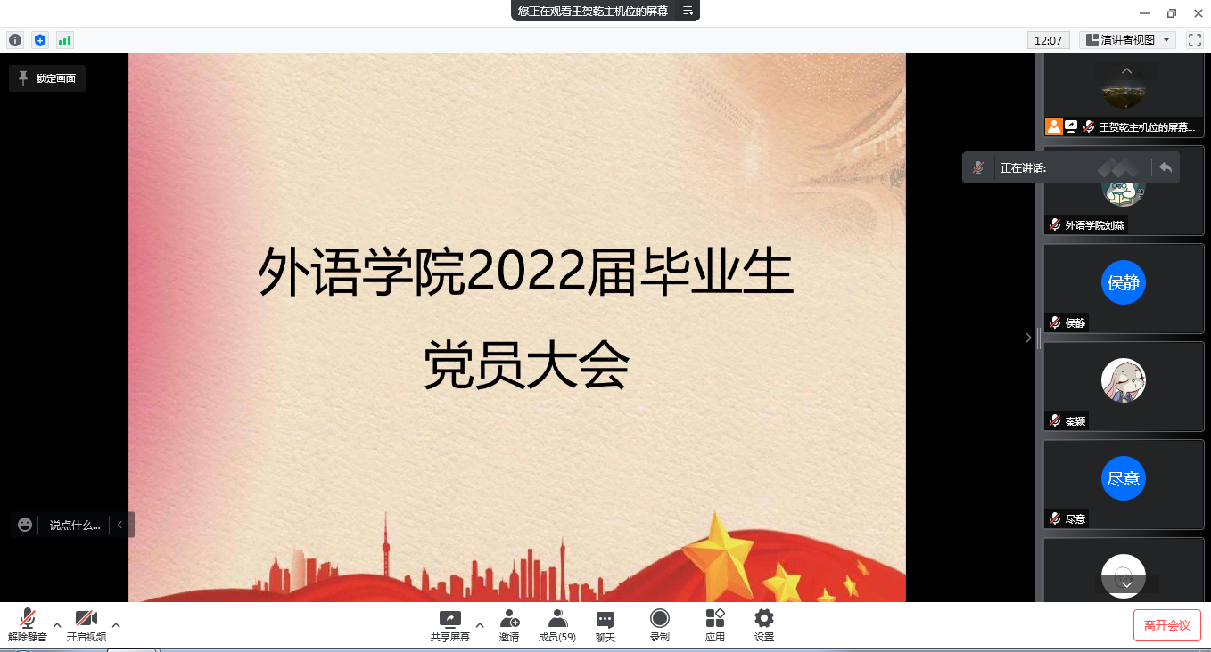为做好2022届毕业生党员的教育管理服务工作,顺利推进毕业生党员党组织关系转接,5月15日中午,allwincity万象城通过腾讯会议的形式召开了2022届毕业生党员大会暨“遵守章程,永葆党性”毕业生党员离校教育主题活动。allwincity万象城党委副书记王頔、allwincity万象城学生第一党支部书记、毕业班辅导员孙颖出席本次大会,全体2022届毕业生党员参加,会议由辅导员王贺乾主持。