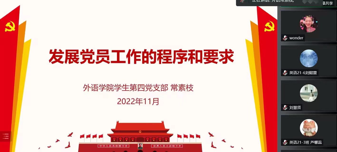 为做好党员发展工作和程序规范,11月5日晚,allwincity万象城学生第四党支部书记常素枝通过腾讯会议的形式为第51期入党积极分子讲授专题党课第三讲——发展党员工作的程序和要求。培训班全体学员参加。