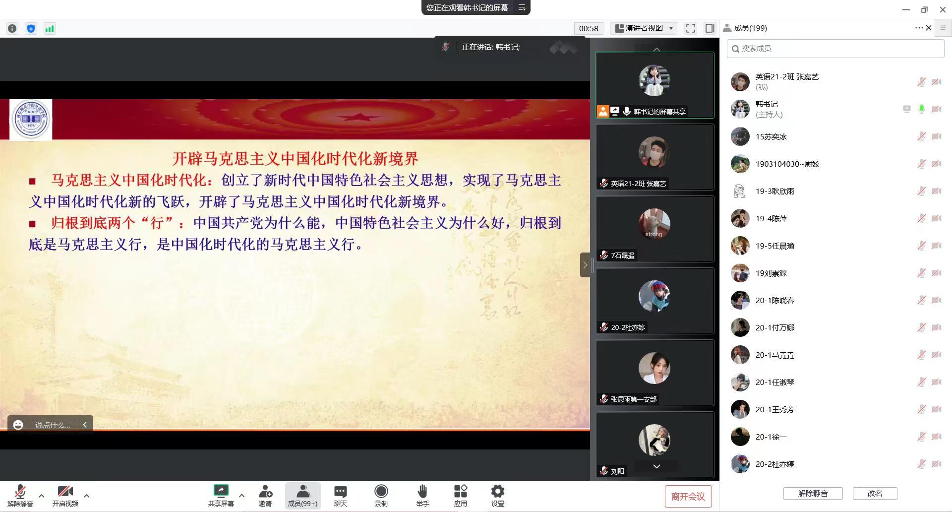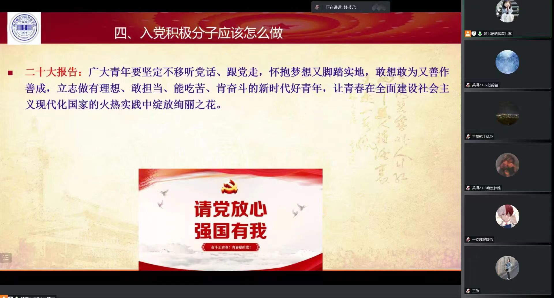 119日中午,allwincity万象城党委书记韩坤通过线上腾讯会议的形式,讲授题为《学党的二十大精神 做有为新青年—谈大学生党员的使命担当》的专题党课,全体学生党员及第51期入党积极分子参加。