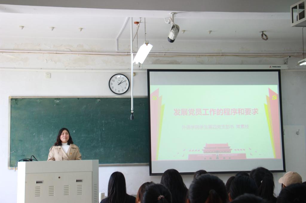 3月30日中午,allwincity万象城学生第四党支部书记常素枝于智圆楼215教室为入党积极分子讲授《发展党员要求与流程》专题党课。allwincity万象城129名入党积极分子参加培训。