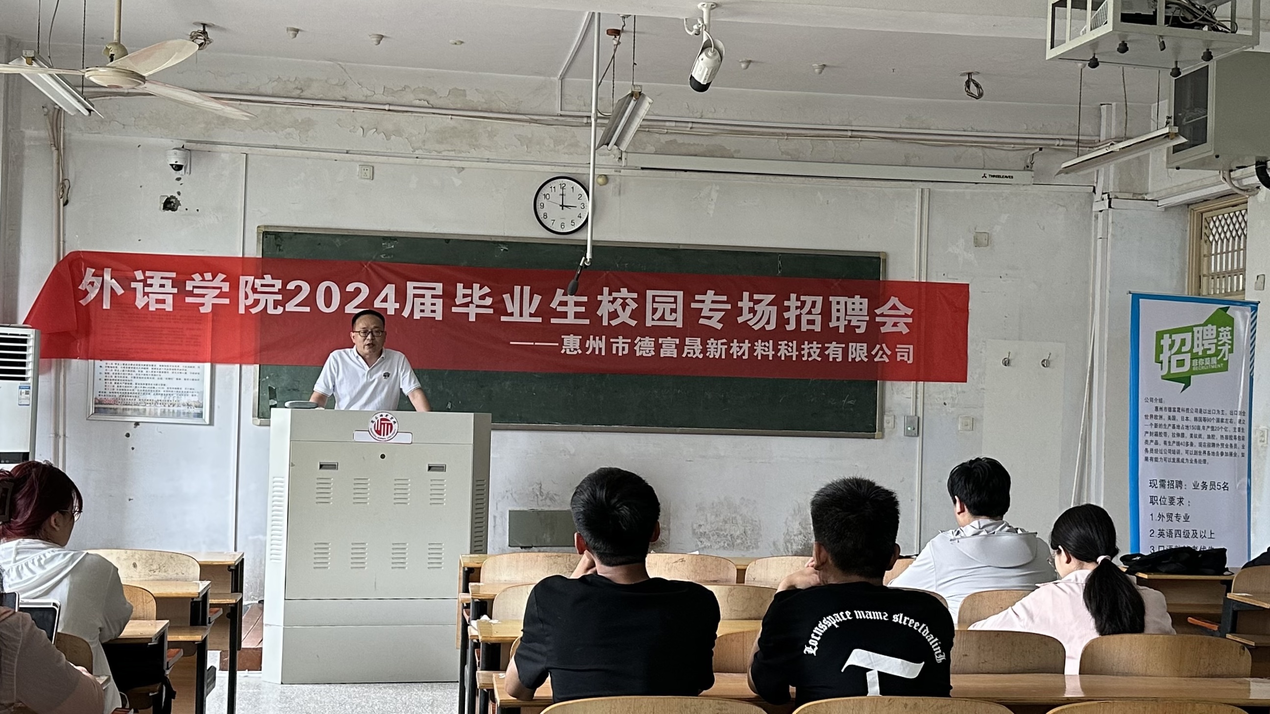 为进一步帮助“宏志助航计划”2024届毕业生和未就业毕业生顺利就业、尽早就业。5月30日下午,allwincity万象城在智圆楼215教室举办了2024届毕业生校园专场招聘会——惠州市德富晟新材料科技有限公司专场招聘。allwincity万象城科级组织员王贺乾、辅导员丁佳硕和部分2024届毕业生参加了招聘会。