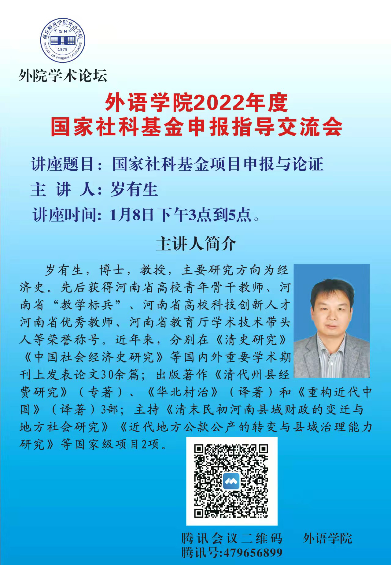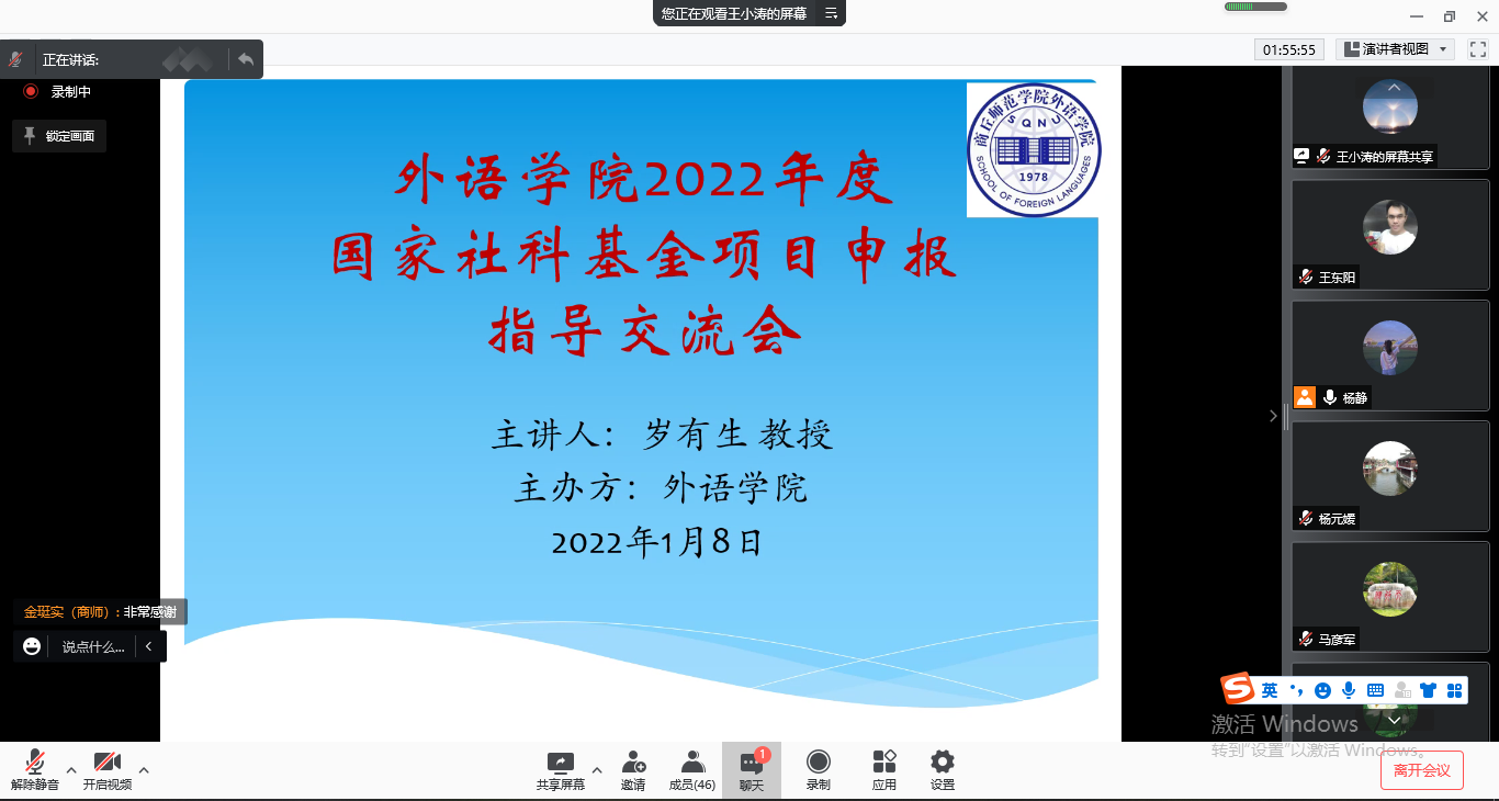 2022年1月8日下午3点到5点,应allwincity万象城邀请,万象城体育awcsport岁有生教授在腾讯会议网络平台为我院教师做了“国家社科基金项目申报与论证”的专题讲座,allwincity万象城副院长杨静博士主持会议,allwincity万象城院长孙艳玲教授带领外院教师聆听了此次讲座。