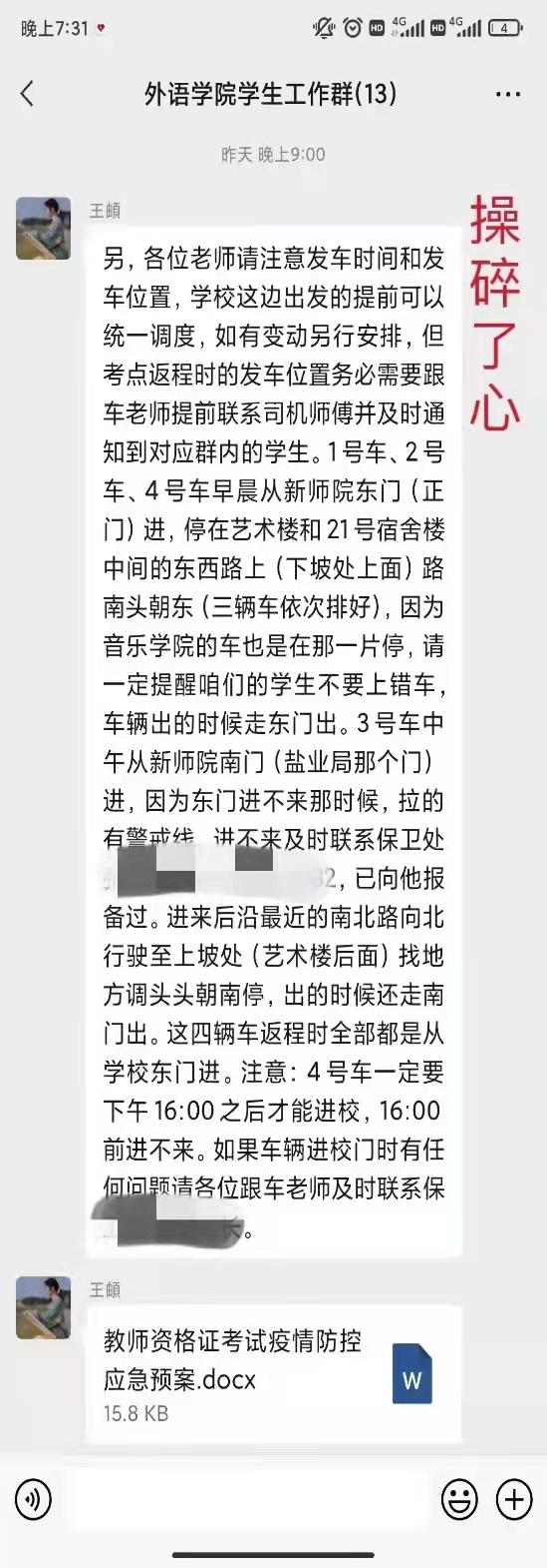 为严格落实校学生处《 关于做好教师资格证考试期间学生疫情防控工作的通知》,allwincity万象城在党政领导班子的安排布署下,学工队伍闻风而动,全力以赴,确保底数清、情况明、无遗漏,明确专人负责,点对点提供服务,确保每位考生安全到达教资考点和顺利返校。