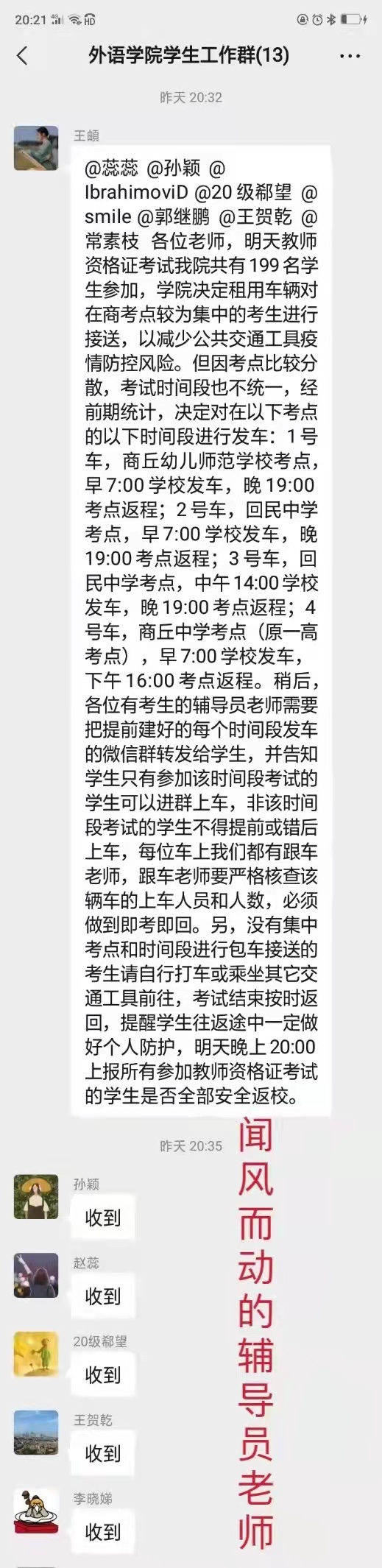 真负责、考虑全面、精细到点而又温暖有加的党委副书记王頔,24小时在线,随时和老师们保持沟通,处理着临时出现的小问题。