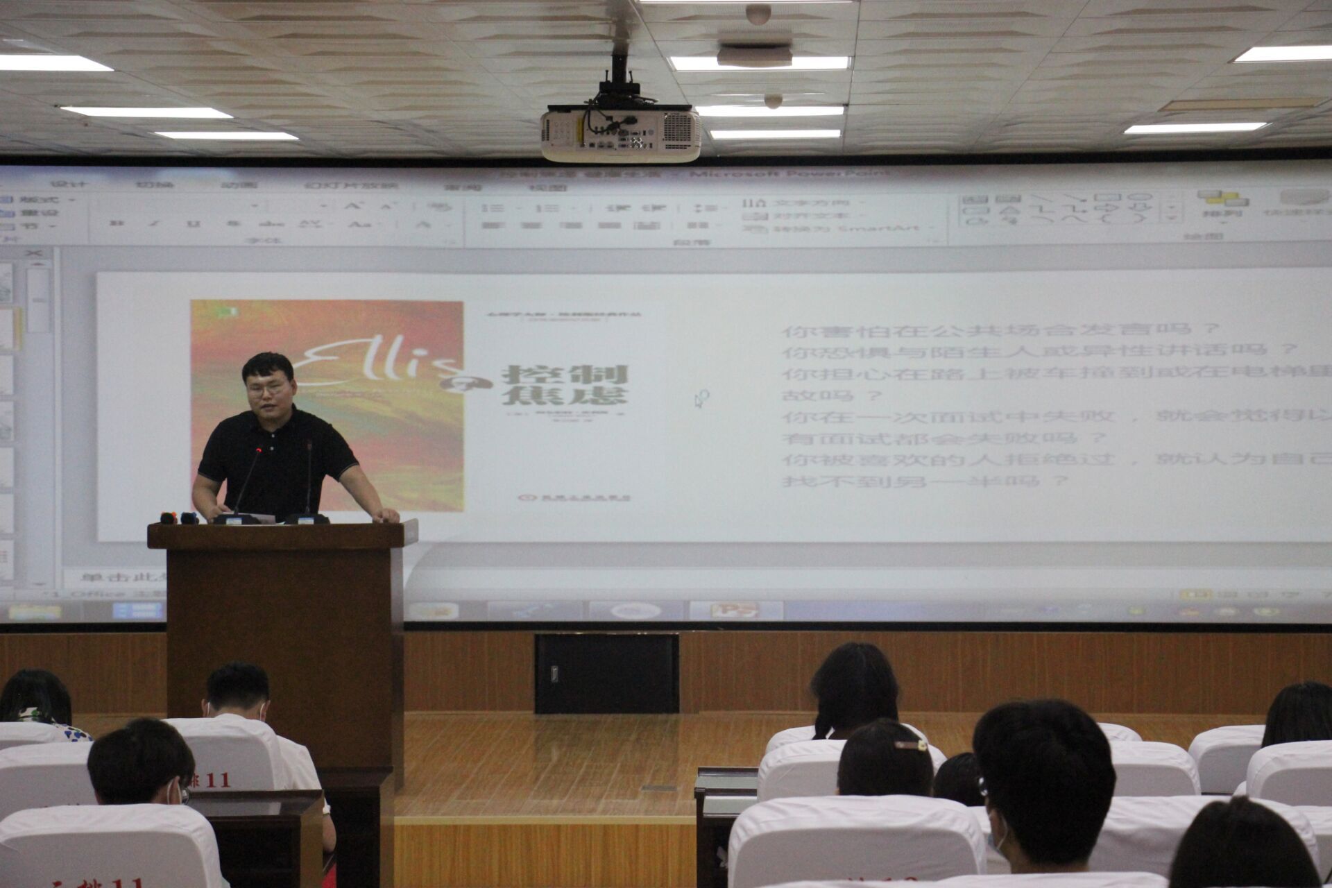讲座伊始,郭继鹏首先询问各位宣传员、信息员对心理健康知识和大学生常见心理问题的了解情况,然后对这些问题进行宣传普及。郭继鹏介绍到,心理问题存在于每一个人当中,每个人心中都会有不如意的时候,关键的问题是用何种方式把心中的压力释放出来。接着,郭继鹏向大家介绍焦虑情绪是什么,是怎么产生的,为同学们讲解可能存在的焦虑问题,并对解决焦虑的成本-收益分析法、幽默感、奖励和惩罚法、暴露疗法和系统脱敏法、羞耻攻击练习法等进行了展开讲述。最后,与大家分享控制焦虑的至理箴言“承认自身生理和物理方面的习性和不足,努力去实现无条件的自我接纳”,以此提醒同学们做到理性平和,养成阳光心态。