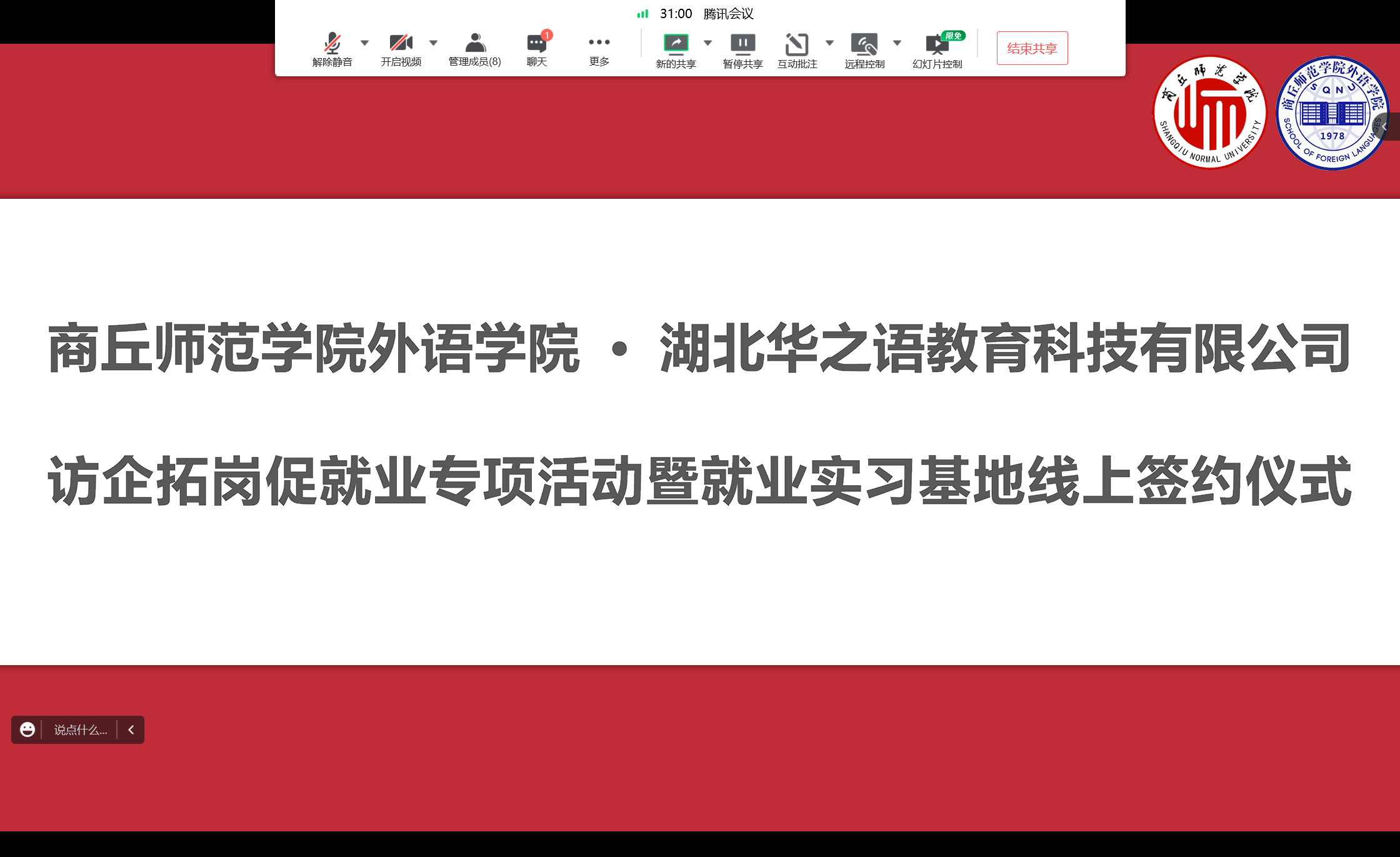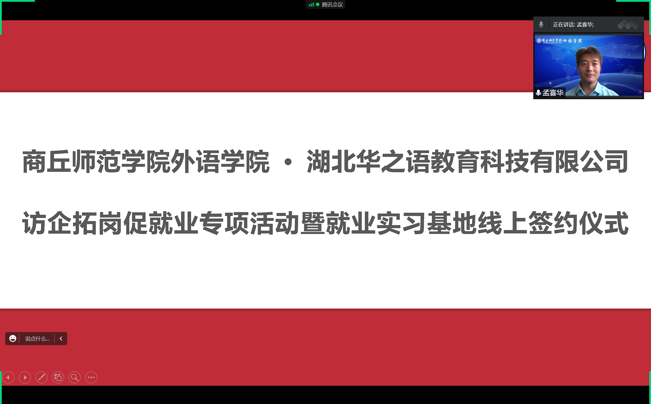 6月29日,allwincity万象城与湖北华之语教育科技有限公司举办访企拓岗促就业专项活动暨就业实习基地线上签约仪式,allwincity万象城党政领导班子成员和华之语教育科技有限公司主要负责人参加,活动通过腾讯会议以及线下相结合的方式进行。