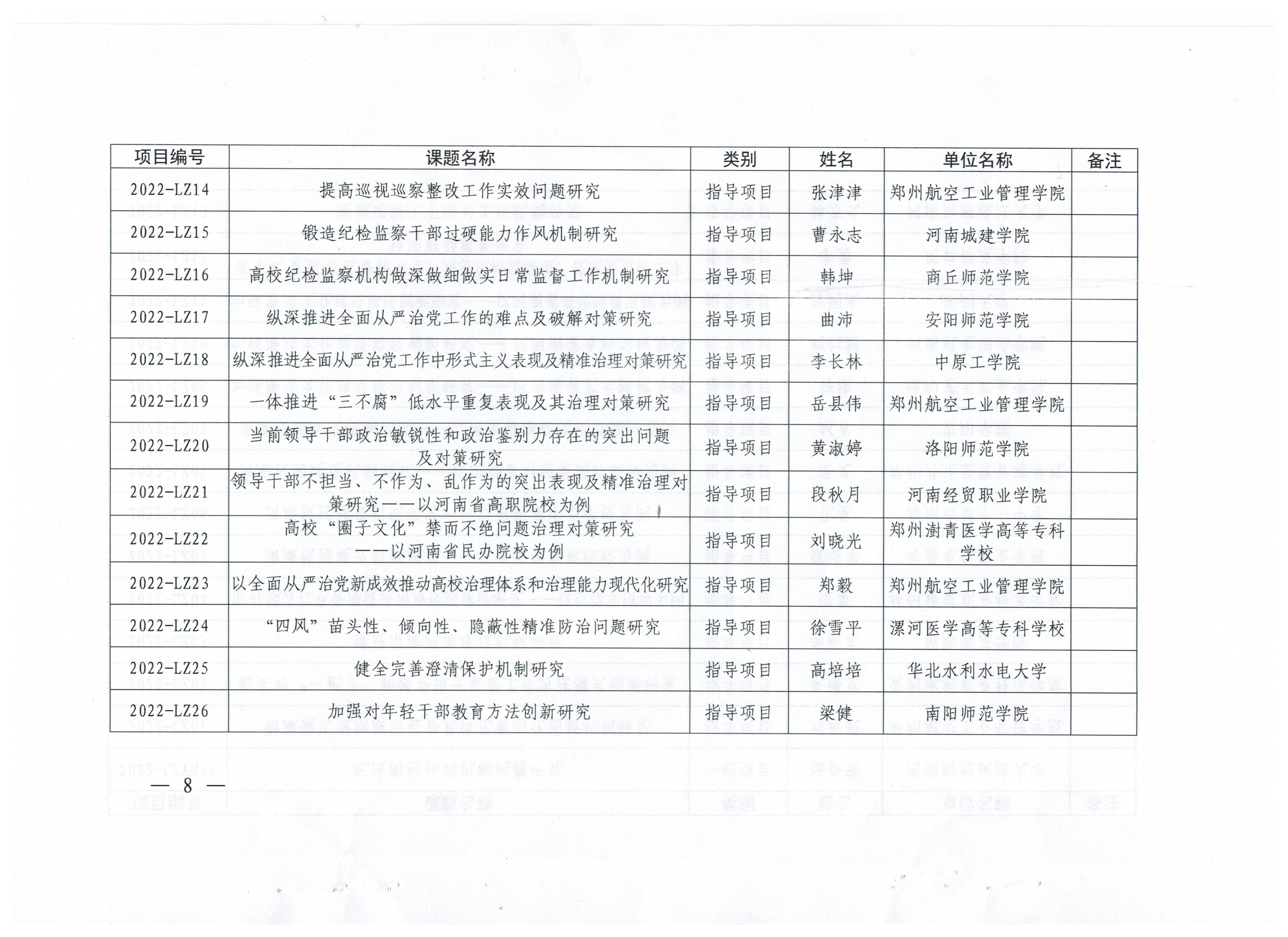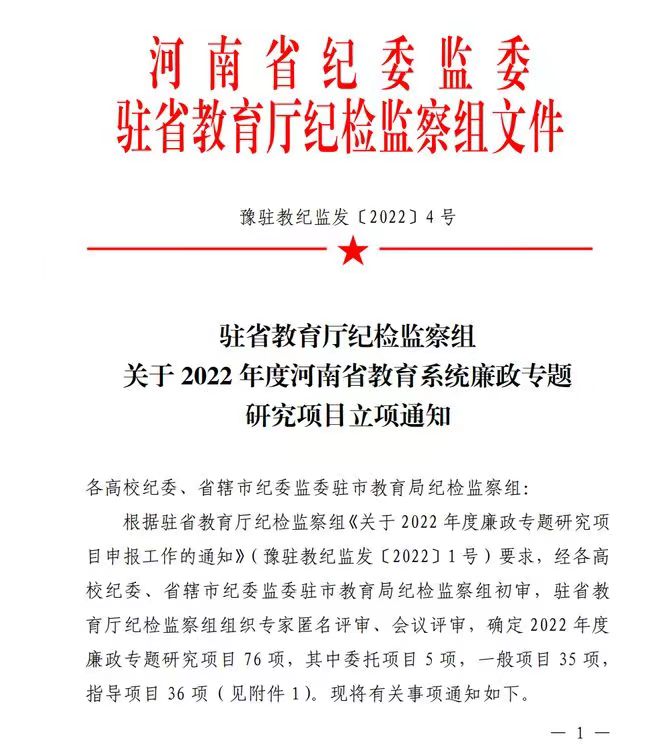 近日,河南省高校纪工委、河南省纪委监委驻省教育厅纪检监察组下发《关于2022年度河南省教育系统廉政专题研究项目立项通知》(豫驻教纪监发〔2022〕4号),公布了2022年度河南省教育系统廉政专题研究项目申报立项结果。我院党委书记韩坤主持的“高校纪检监察机构做深做细做实日常监督工作机制研究”(编号2022-LZ16)喜获立项。我校共获批一项,这也是我校近三年以来首次获批此项目。