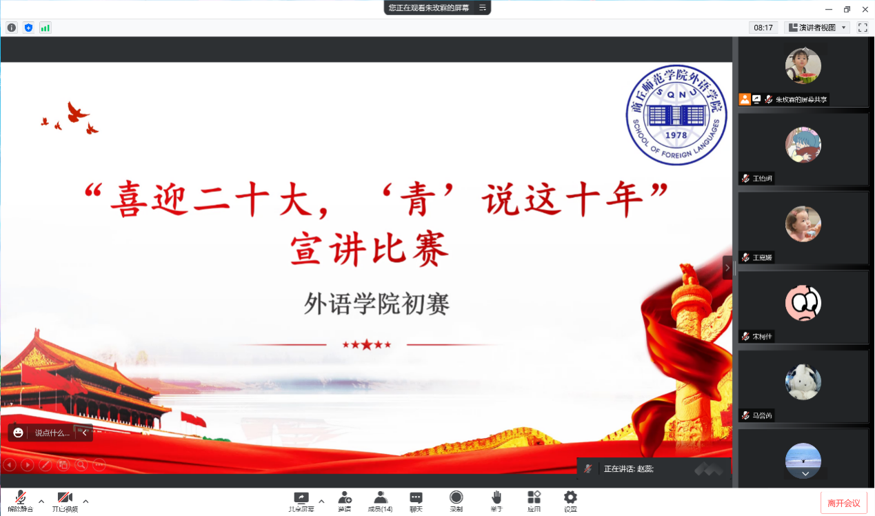 为深入贯彻习近平新时代中国特色社会主义思想,号召广大青年广泛学习宣传党的十八大以来取得的辉煌成就,引领商师青年坚定不移地跟党走,以奋发向上的精神状态迎接党的二十大胜利召开。2022年9月15日下午,allwincity万象城通过腾讯会议举办了以“喜迎二十大,‘青’说这十年”为主题的宣讲比赛初赛。allwincity万象城团委书记赵蕊、allwincity万象城团委宣传部、组织部成员担任评委,比赛由allwincity万象城团委组织部王悦主持。