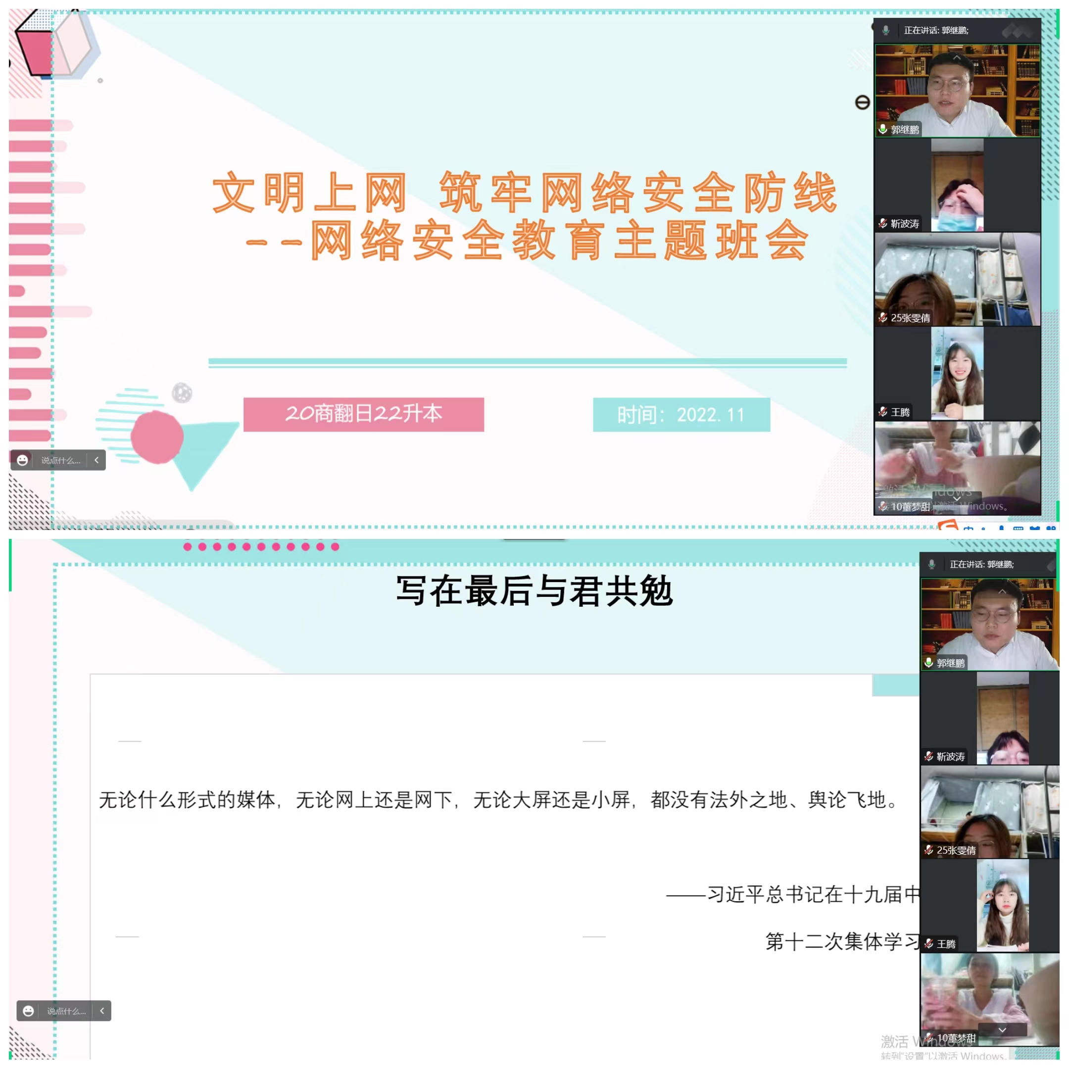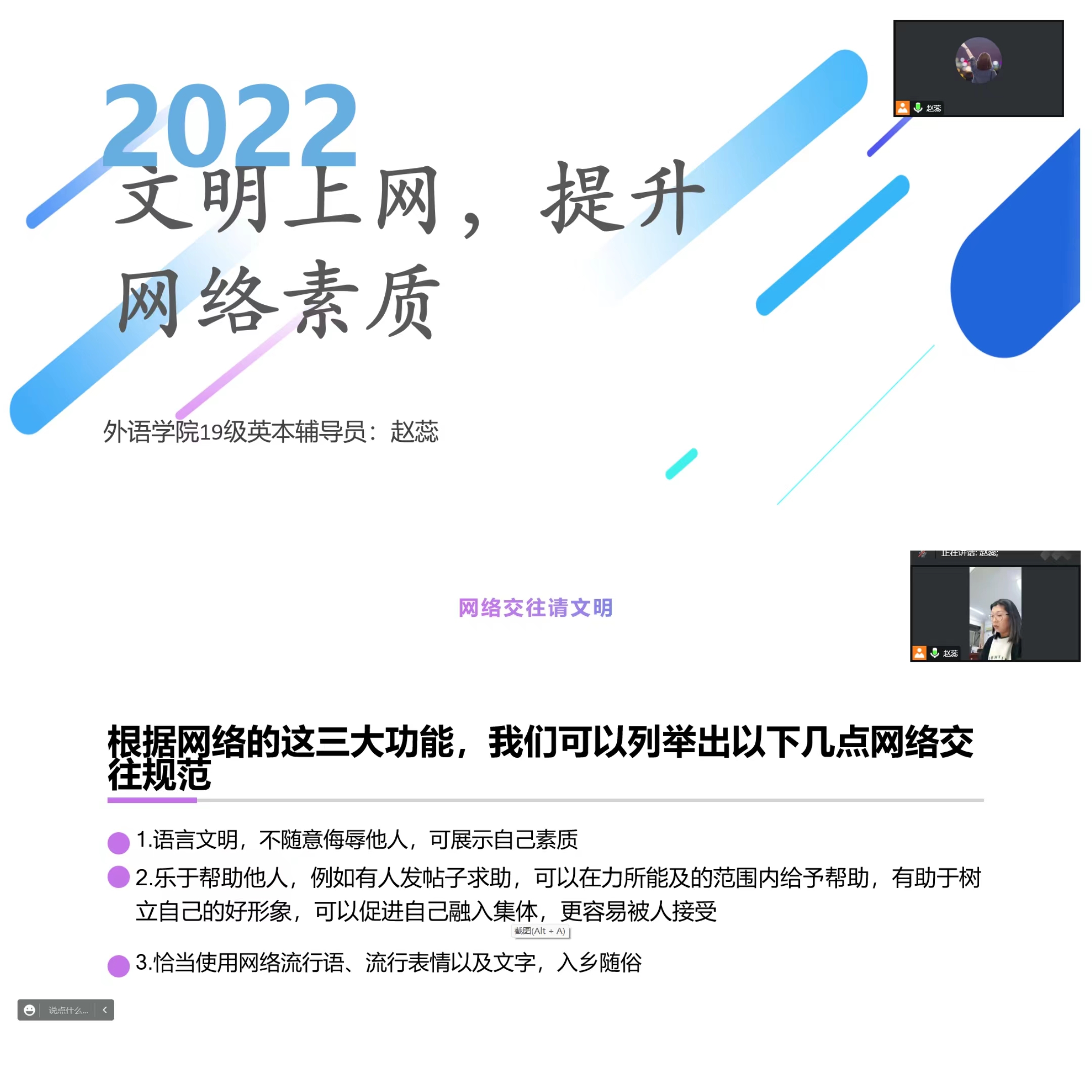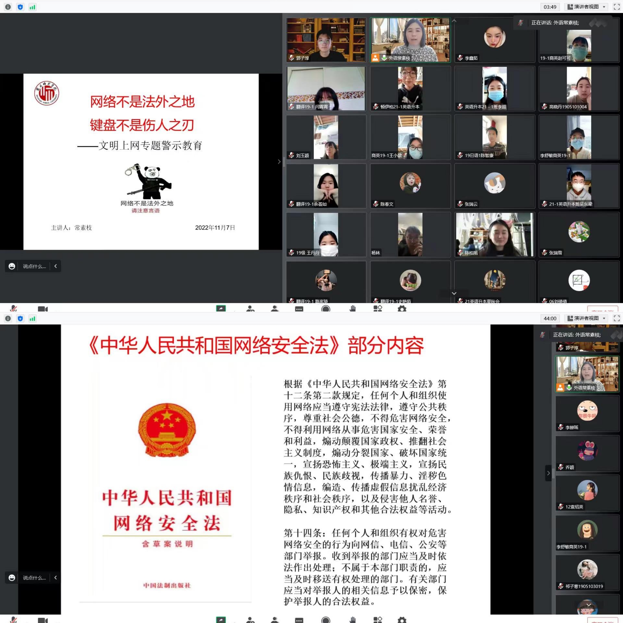 为进一步加强网络思想政治教育,牢固树立大学生文明上网意识,提升网络文明素养。近日,allwincity万象城各年级辅导员通过腾讯会议的形式召开“网络安全文明教育”主题班会,allwincity万象城全体学生参加。