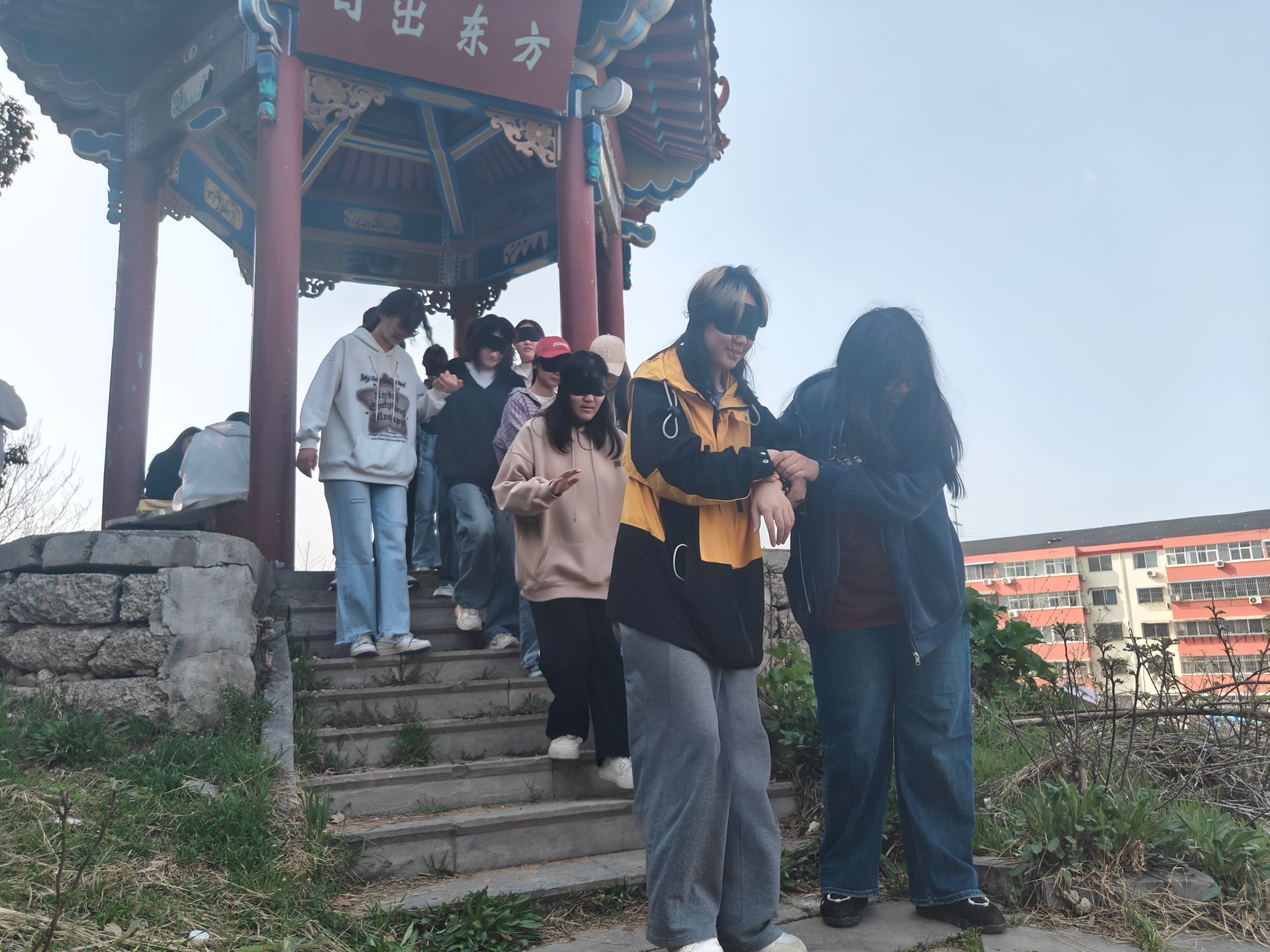 郭继鹏首先带领同学们进行第一项活动——游戏互动之“盲人”旅行。有一位同学戴上眼罩充当“盲人”,另一位同学则充当“拐杖”,两人相互合作,一起爬上文秀山。在这个过程中,“盲人”需要完全信任“拐杖”的引导,而“拐杖”则需要细心照顾“盲人”的安全。最终,所有参与的同学都成功登顶,并在山顶分享了彼此的感悟,通过活动同学们深刻体会到了信任和合作的重要性。接着,第二项进行的是“解开‘手链’”活动,活动中,全体同学先被分为两组,然后并为一组,围成一个大圈,并且要记住自己左右手相握的人,在富有节奏、轻松欢快的背景音乐中,大家可以放开手,随意走动。音乐停止,脚步即停,这时同学们需要找到原来的伙伴,并握住对方的手。整个活动过程气氛融洽,充满着欢声笑语,同学们灵活应变、相互配合,最终顺利解开“手链”,也充分展示了团队的智慧和力量。
