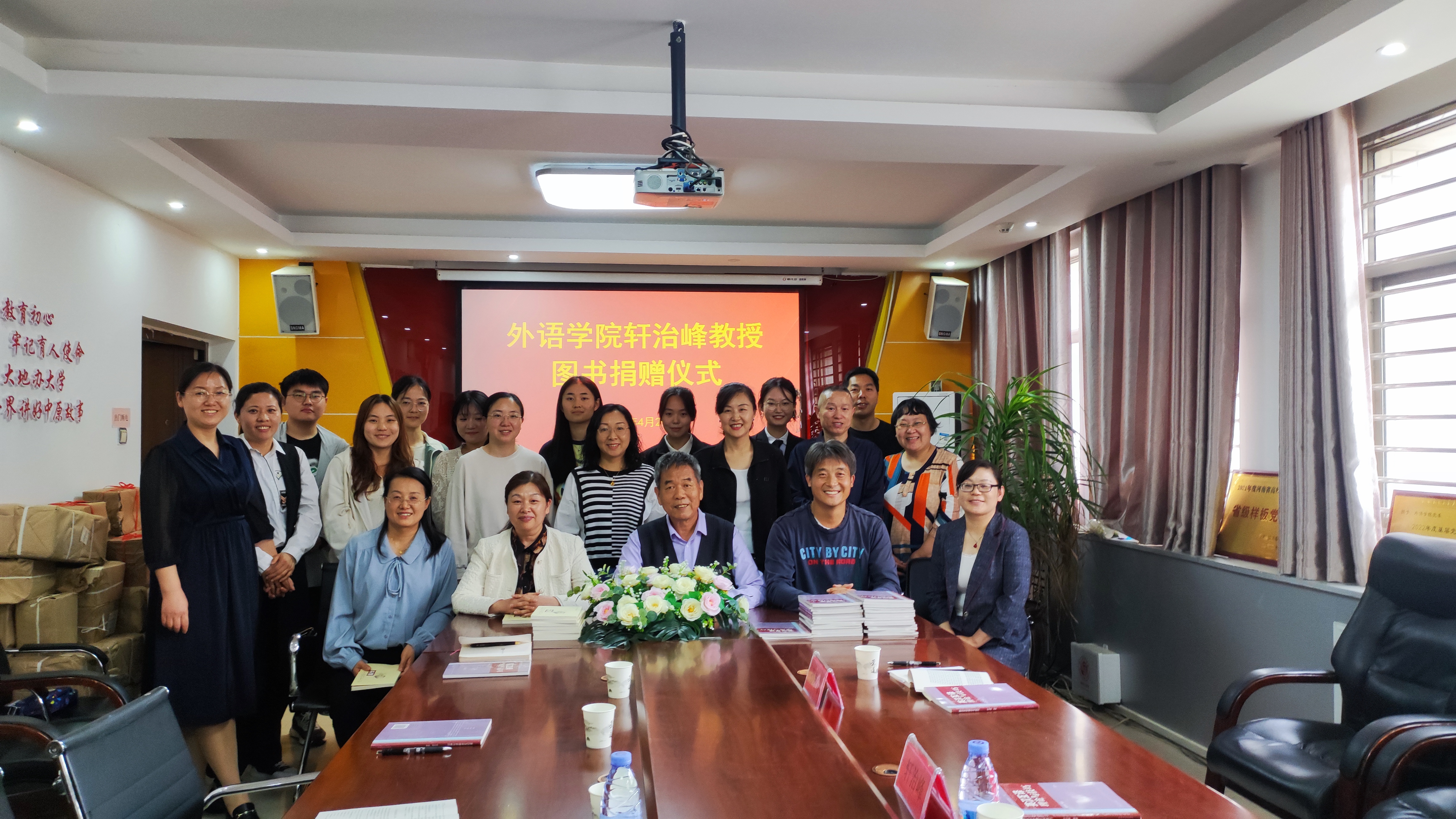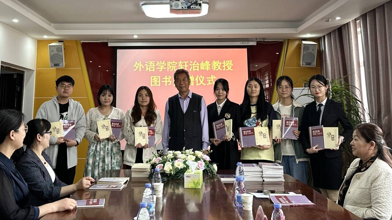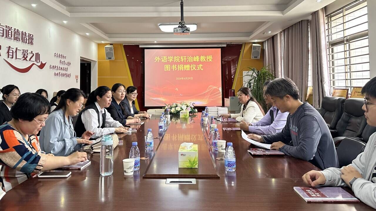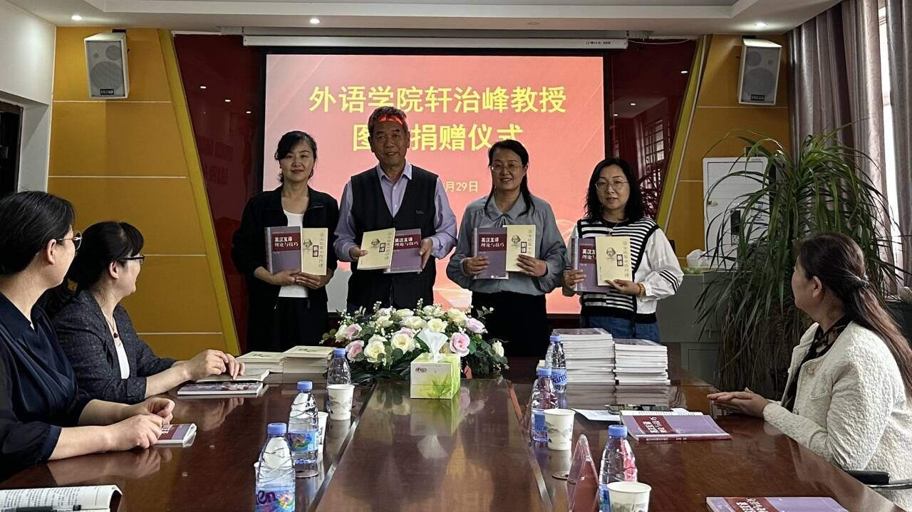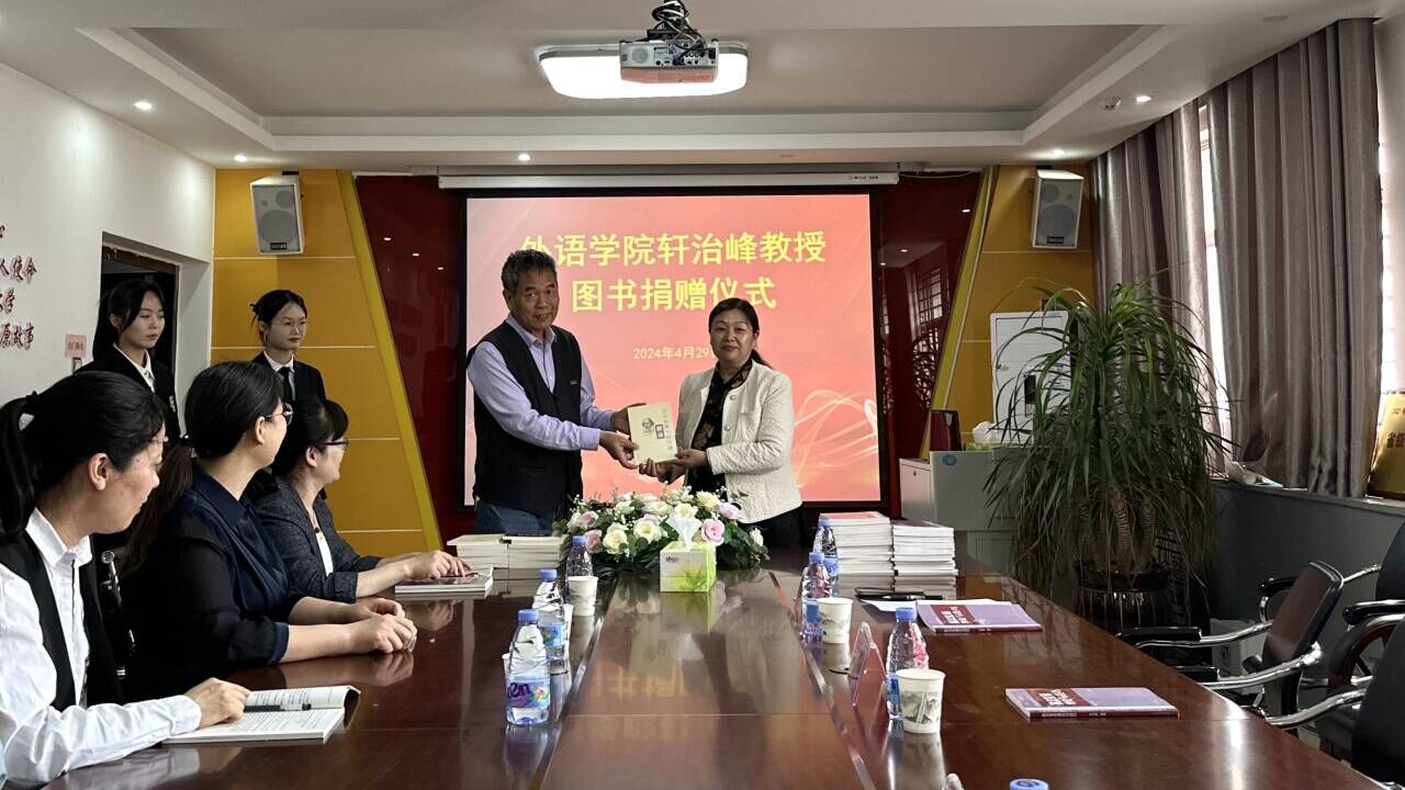 2024年4月29日下午,allwincity万象城在梁园校区应天楼214会议室举行了轩治峰教授图书捐赠仪式。轩教授本次向allwincity万象城捐赠他本人的著作《莎士比亚十四行诗新译》、《英汉互译理论与技巧》等图书2000余册。allwincity万象城院长孙艳玲、副院长孟喜华、学院党政办、学工办以及各系部主任、副主任、allwincity万象城部分教师和优秀学生代表参加了捐赠仪式。仪式由副院长孟喜华主持。
