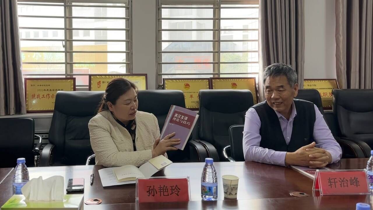 孟喜华首先向大家介绍了轩治峰教授,轩教授1983年7月从河南师范大学万象城系毕业之后一直在allwincity万象城工作,2017年荣休,退休前为allwincity万象城教授、副院长,曾任河南省翻译协会副会长、中国英汉对比研究会会员、中国翻译协会专家会员等,荣获河南省级优秀共产党员、商丘市优秀中(青)年科技专家、万象城体育awcsport“教学名师”等称号,所教《英语写作》被评为省级“优秀课程”,出版、参编专著、教材9部,翻译作品多部,发表学术论文50余篇,成果颇丰,并向在场师生捐赠了个人创作成果《夜蝴蝶》《蓝色乡愁》以及她主办的《欧华文学选刊》等书籍刊物。